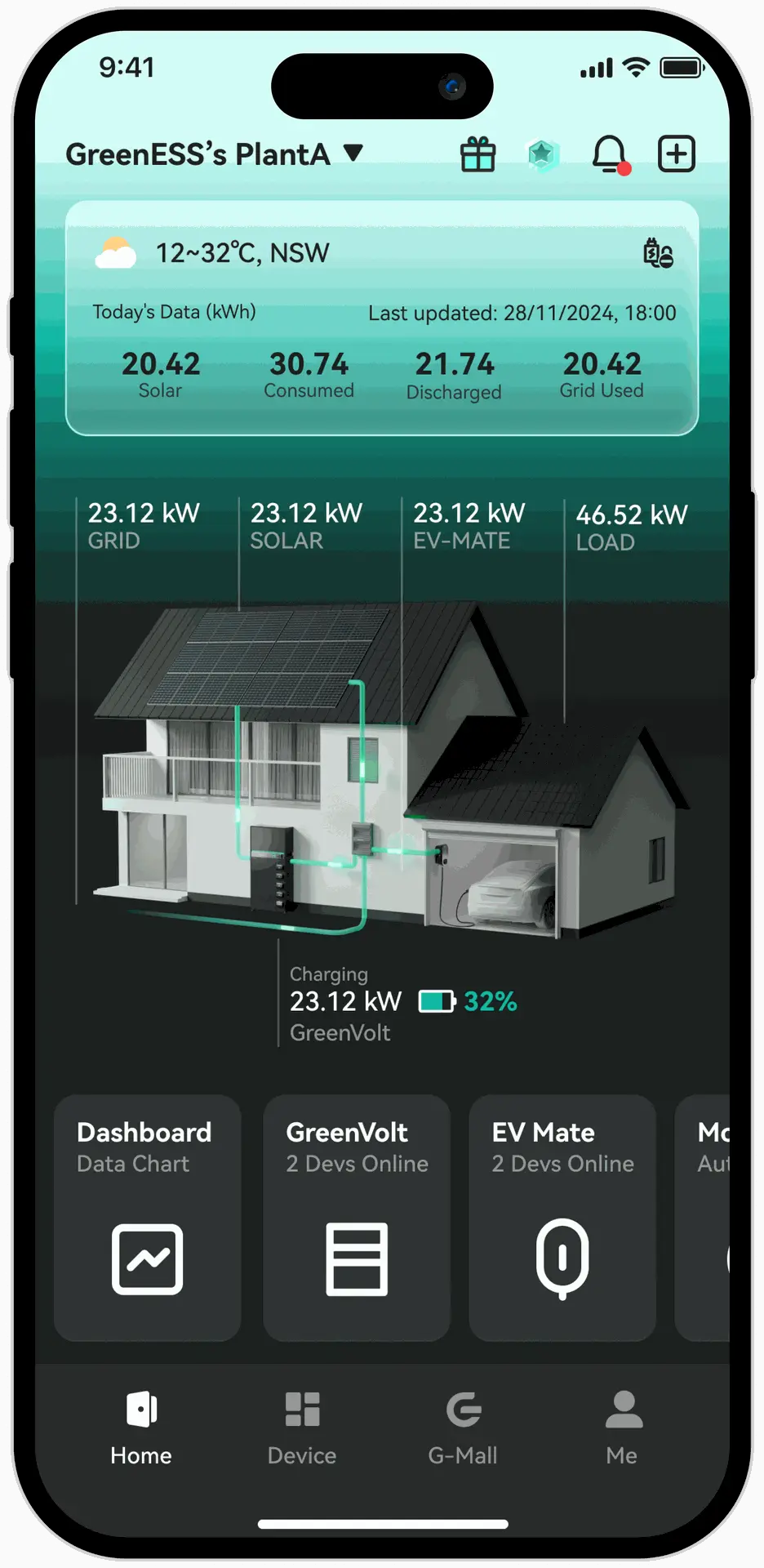 The Greeness app offers an all-in-one experience for you to manage your Greeness energy products from anywhere and at any time. To get started, download the Greeness app from the App Store or Google Play store and sign in to your Greeness Account.